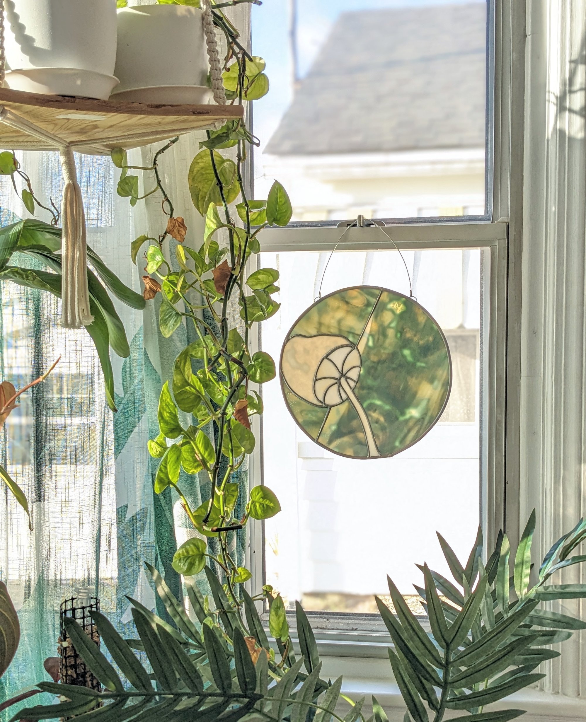 Materials: Stained glass, lead frame, lead solder, hanging wire.