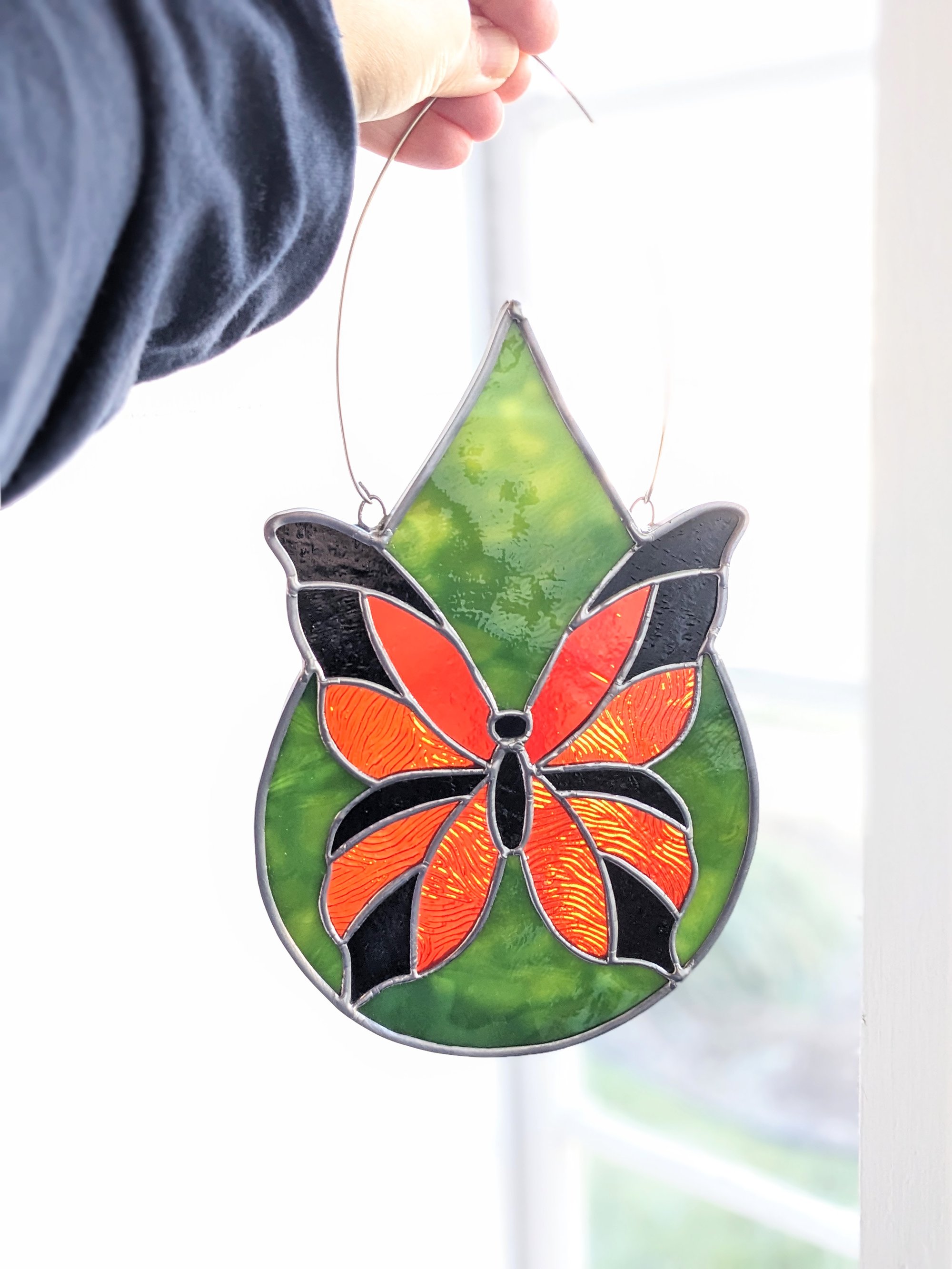 This piece was made with a couple different kinds of transparent orange water glass, including a textured fingerprint glass, as well as black glass accents. The background is made with Pennsylvania Youghiogheny semi-transparent, mottled green stained glass.