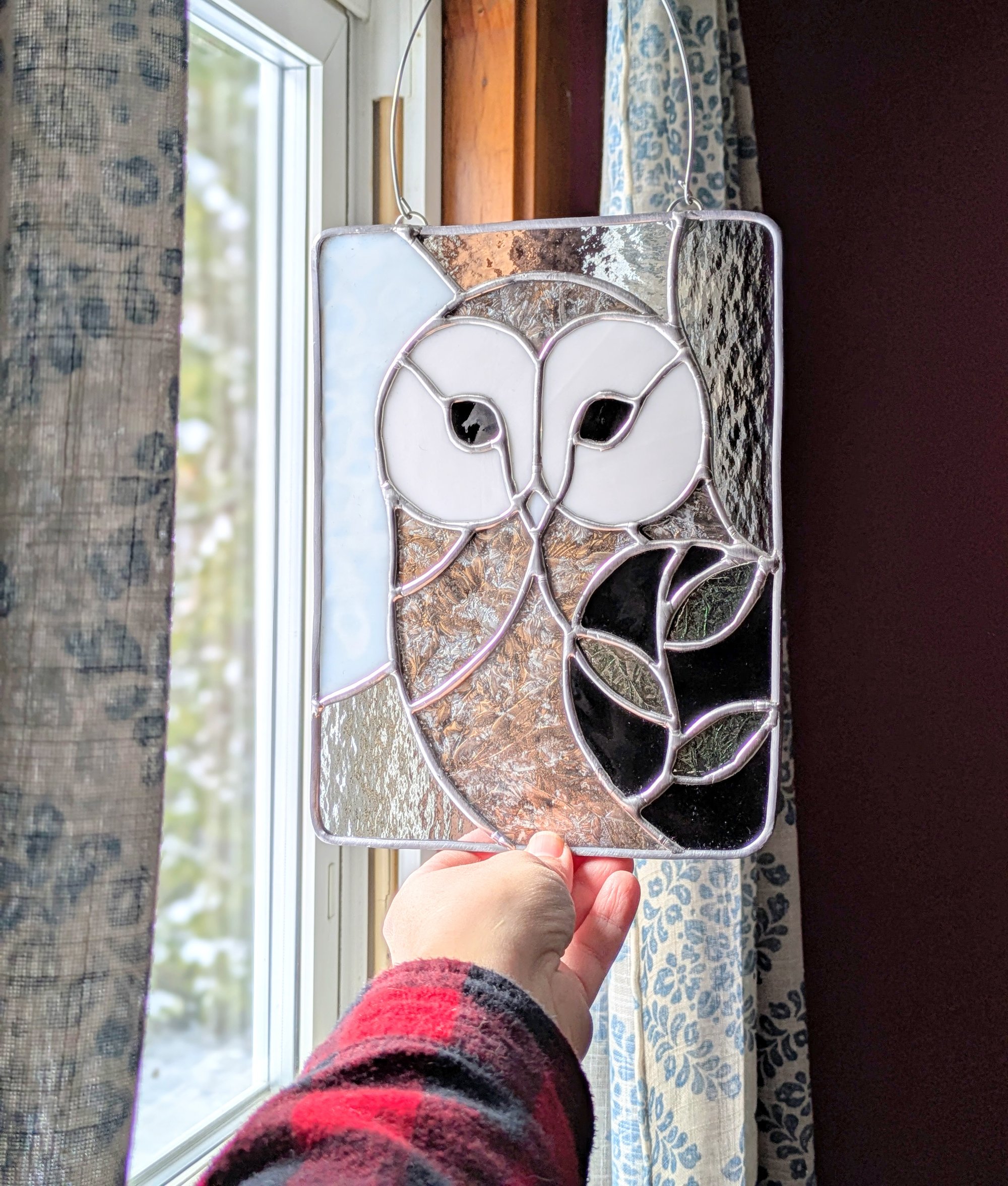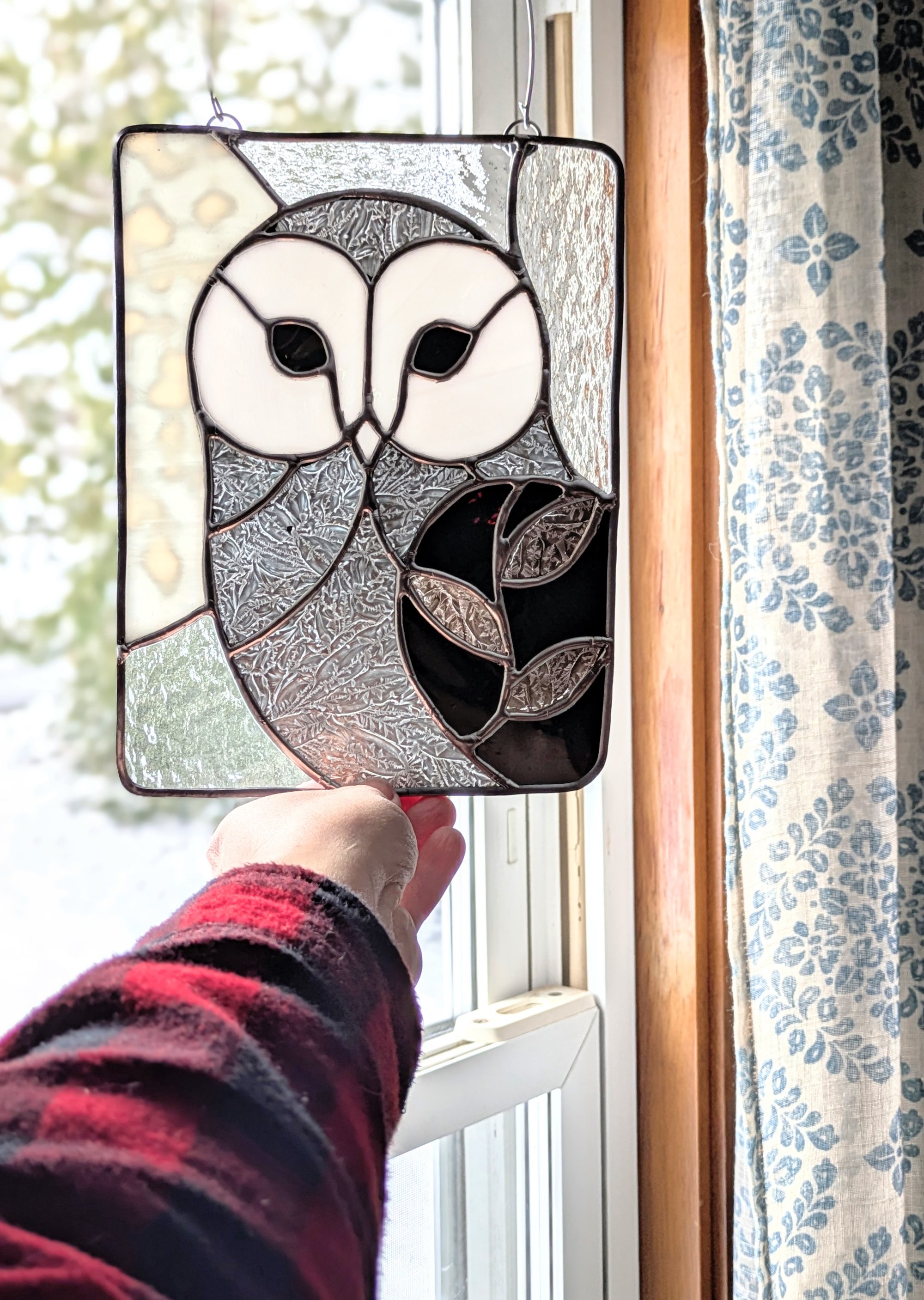 In true barn owl style - now you see me, now you don't! Van Gogh stained glass is unique in that out of the sunlight, it has color but then once put into sunlight, it turns into a black and white frosty leaf pattern. I used this glass to honor the bold stealth of our barn owl cousins who fly completely silent through the woods to catch their prey at night.